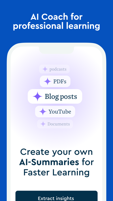 Blinkist Pro offers AI-powered summaries of articles, PDFs, and videos. Enable it via Settings > Upgrades > Blinkist Pro.