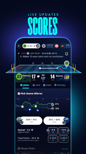 The app provides real-time updates for scores, stats, and news across various sports, accessible from the 'Scores' tab, ensuring you stay updated during games.