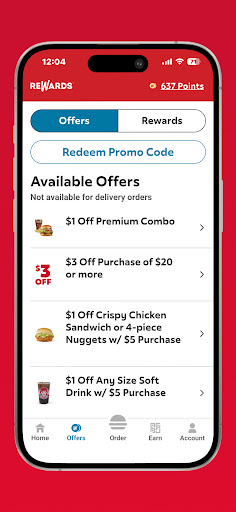 Tap ‘Earn' during your visit or drive-thru, scan or order with the app, and accumulate points redeemable for free food.